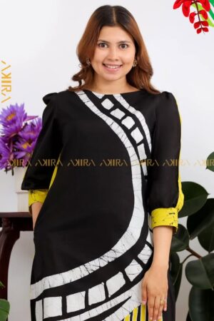 A contemporary batik design with bold dark hues, blending tradition with a sleek modern silhouette.