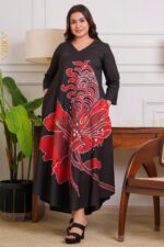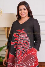 Alina huge flora batik dress in rich crimson tones with intricate Java-inspired patterns.