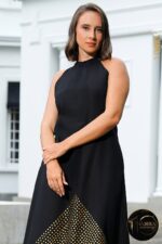 A stylish, elegant designer dress with a flattering silhouette and refined detailing, perfect for formal or special occasions