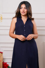 A sleek linen dress from Akira, cut in a clean, straight “line” silhouette.
