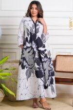 A Azura batik elegant designer dress by the elegance of dahlias, featuring refined batik patterns in rich, feminine tones. Perfect for sophisticated gatherings and timeless charm.