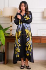 A Batik Dream Luxe Silk Party Dress inspired by golden floral charm, featuring elegant detailing and a graceful silhouette that shines with timeless sophistication.