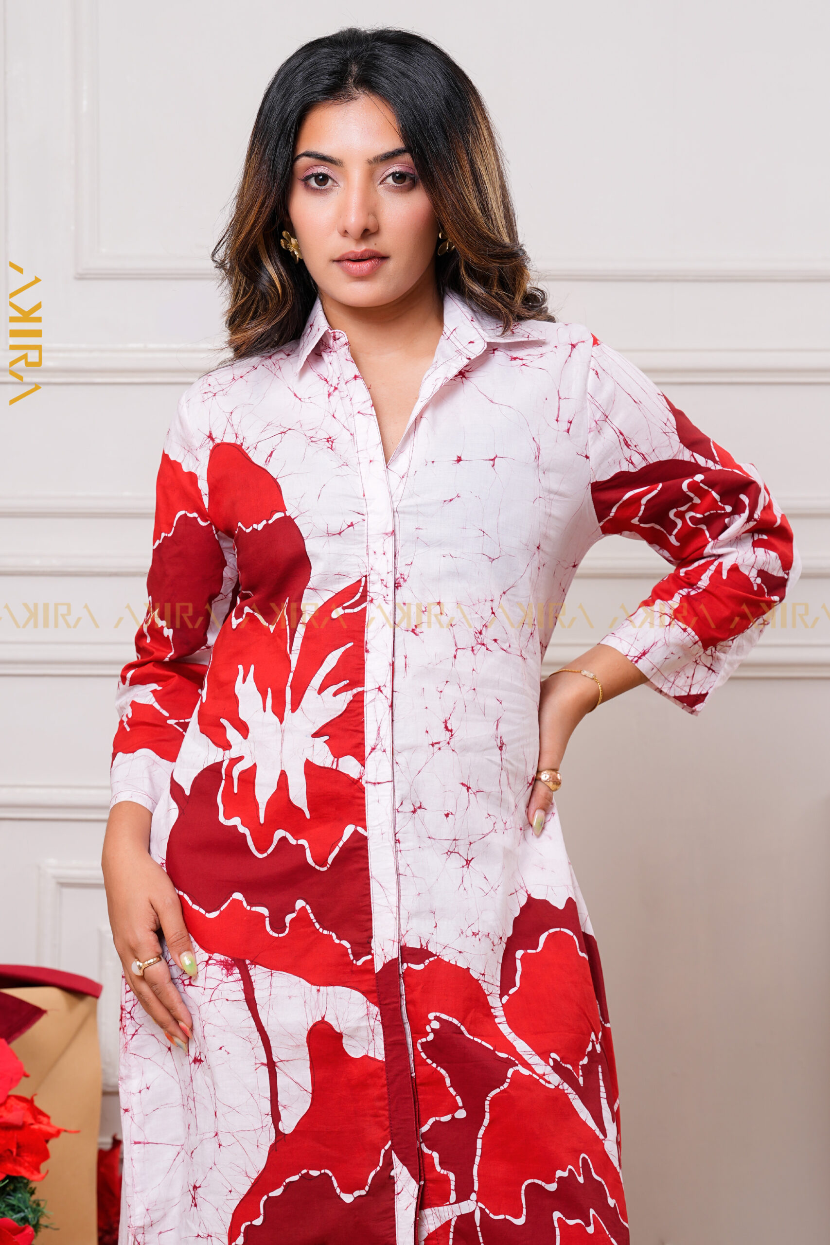 A stylish red dress with floral accents and a flattering silhouette, perfect for casual or dressy occasions.