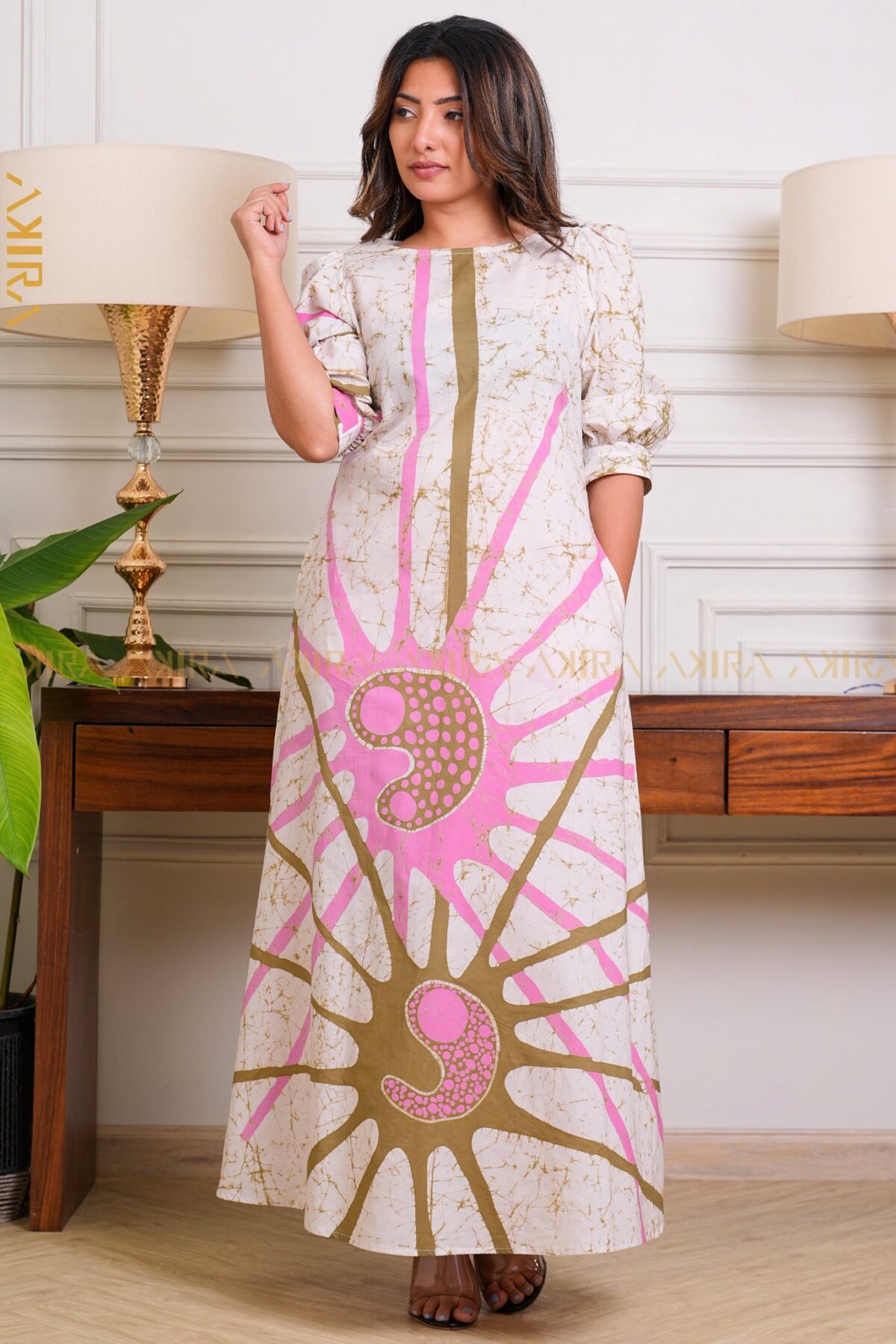 The “Camellia Charm” batik-designer dress features a refined silhouette crafted from rich batik-printed fabric, blending heritage artistry with modern fashion.