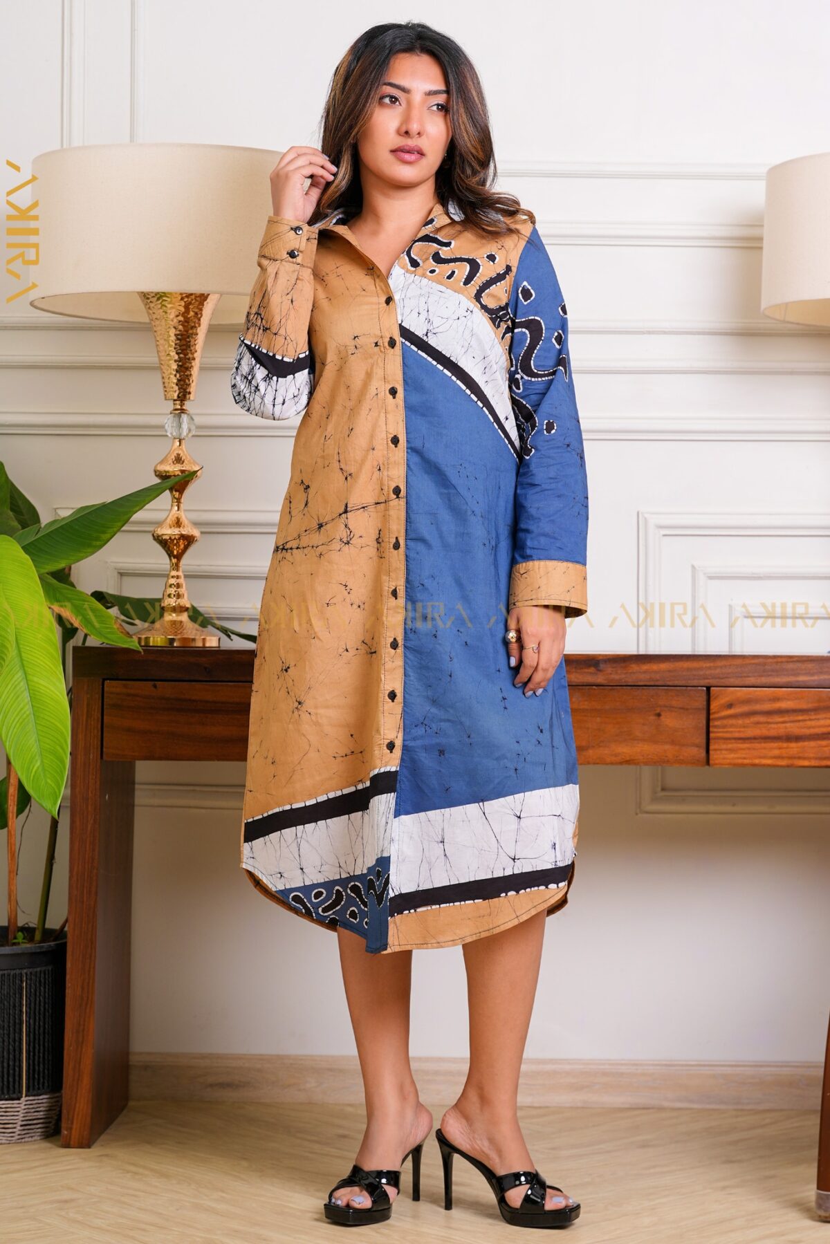 A graceful, breathable batik cotton dress adorned with delicate floral motifs, blending traditional artistry with a modern silhouette. It’s designed for warm weather or festive settings, offering both elegance and comfort.