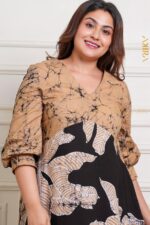 A Coral dusk flowery batik dress by the elegance of dahlias, featuring refined batik patterns in rich, feminine tones. Perfect for sophisticated gatherings and timeless charm.