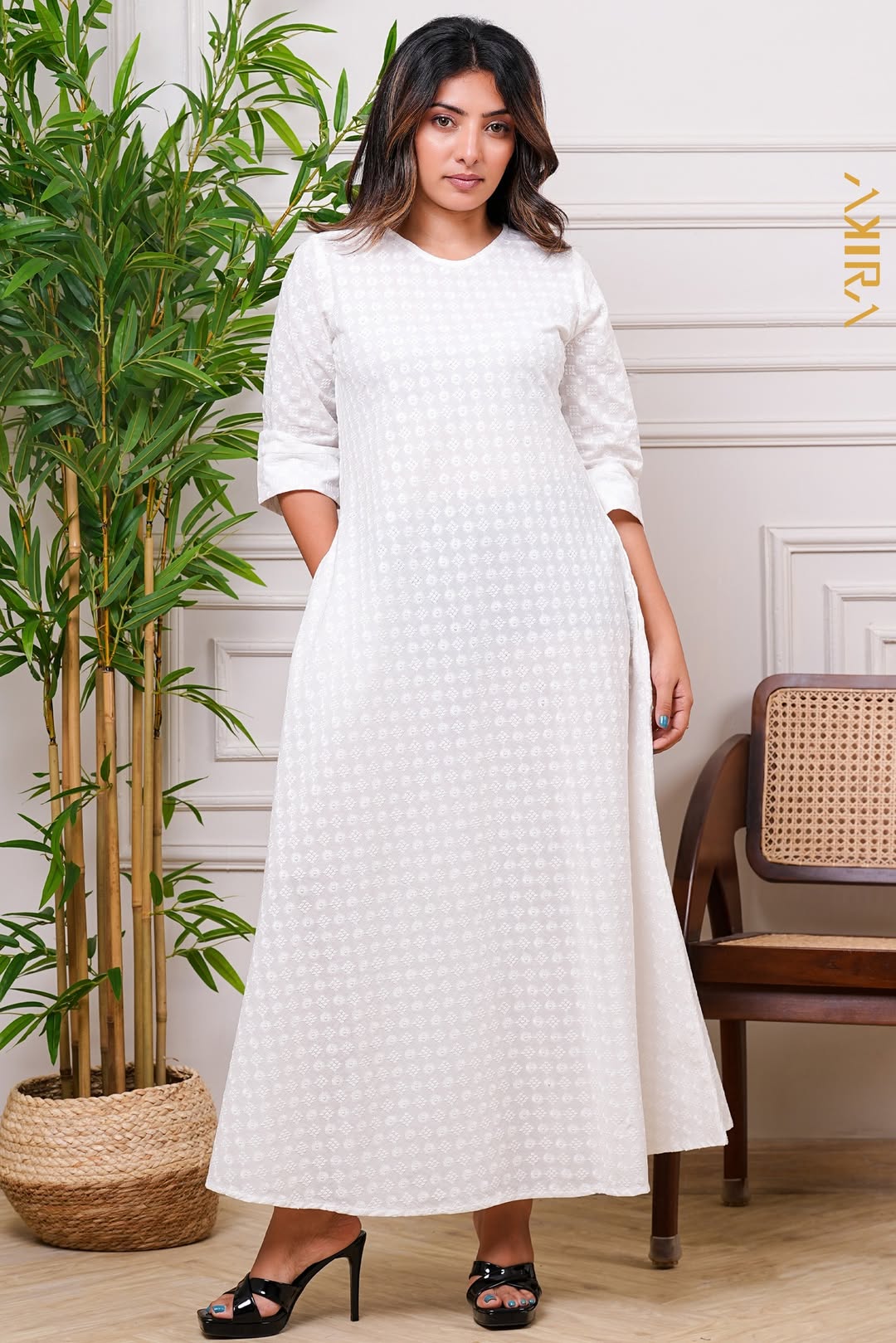 A graceful, nature-inspired dress with botanical motifs — flowing silhouette, soft fabric, and a timeless, elegant feel