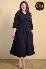 A bold and alluring dress with deep, mysterious tones and a captivating silhouette for a strikingly elegant loo