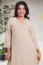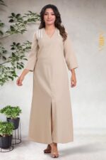 A graceful dress inspired by desert florals, featuring warm tones and a flowing silhouette for an elegant, natural look