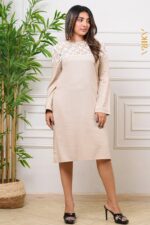 A sleek linen dress from Akira, cut in a clean, straight “line” silhouette.