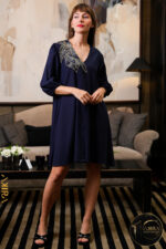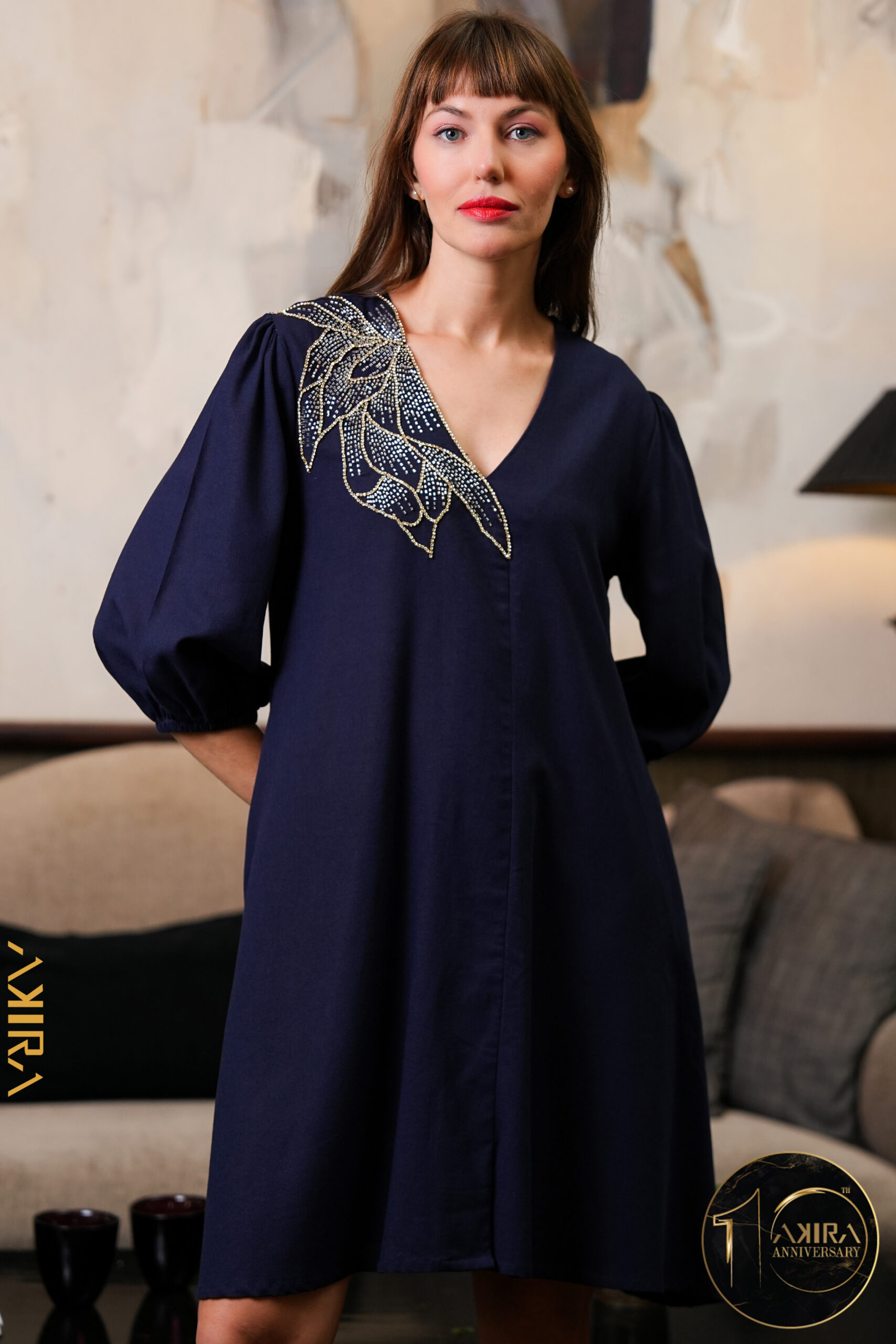 A sleek linen dress from Akira, cut in a clean, straight “line” silhouette.