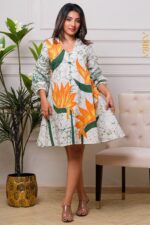 A soft batik-cotton dress with delicate “forgot-me-not” floral print, designed in a breezy, relaxed silhouette for a graceful, airy look