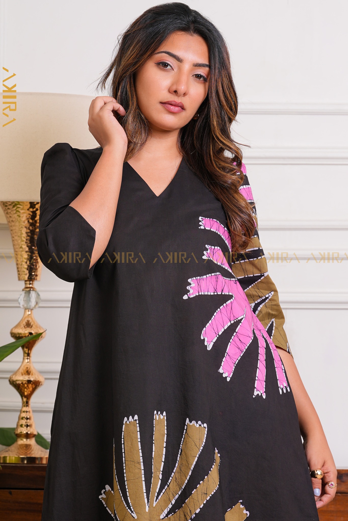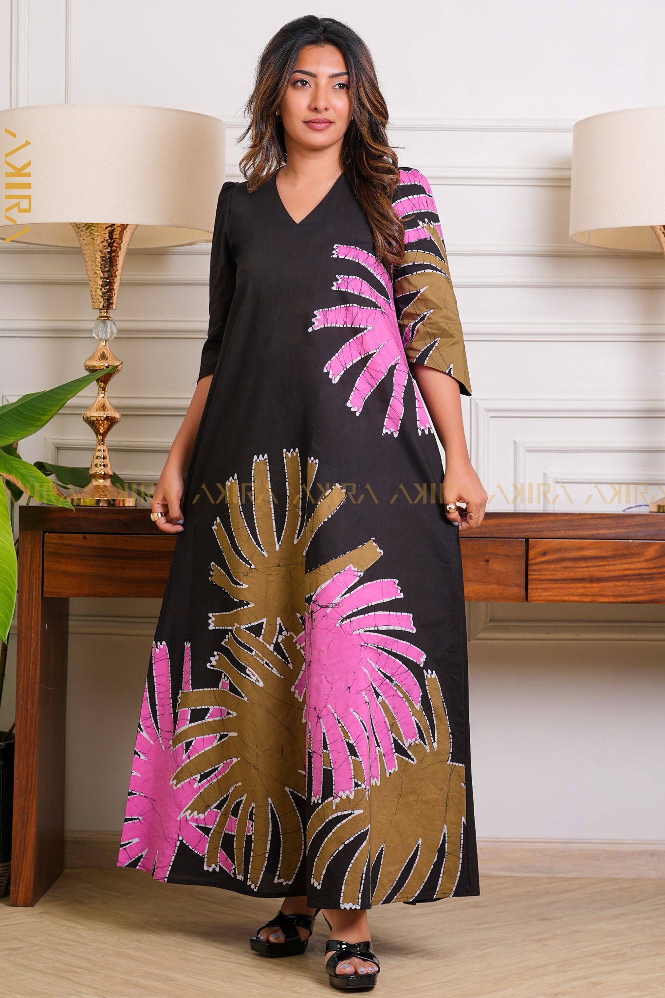 A Elegant Anthuriyam Batik Dress features vibrant floral batik motifs on lightweight, breathable fabric, combining traditional batik art with contemporary silhouette and relaxed elegance.