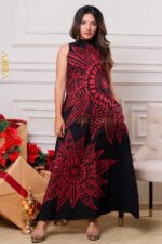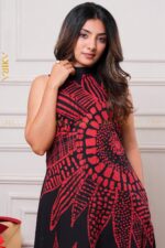 A chic designer dress featuring intricate batik patterns with contemporary elegance.