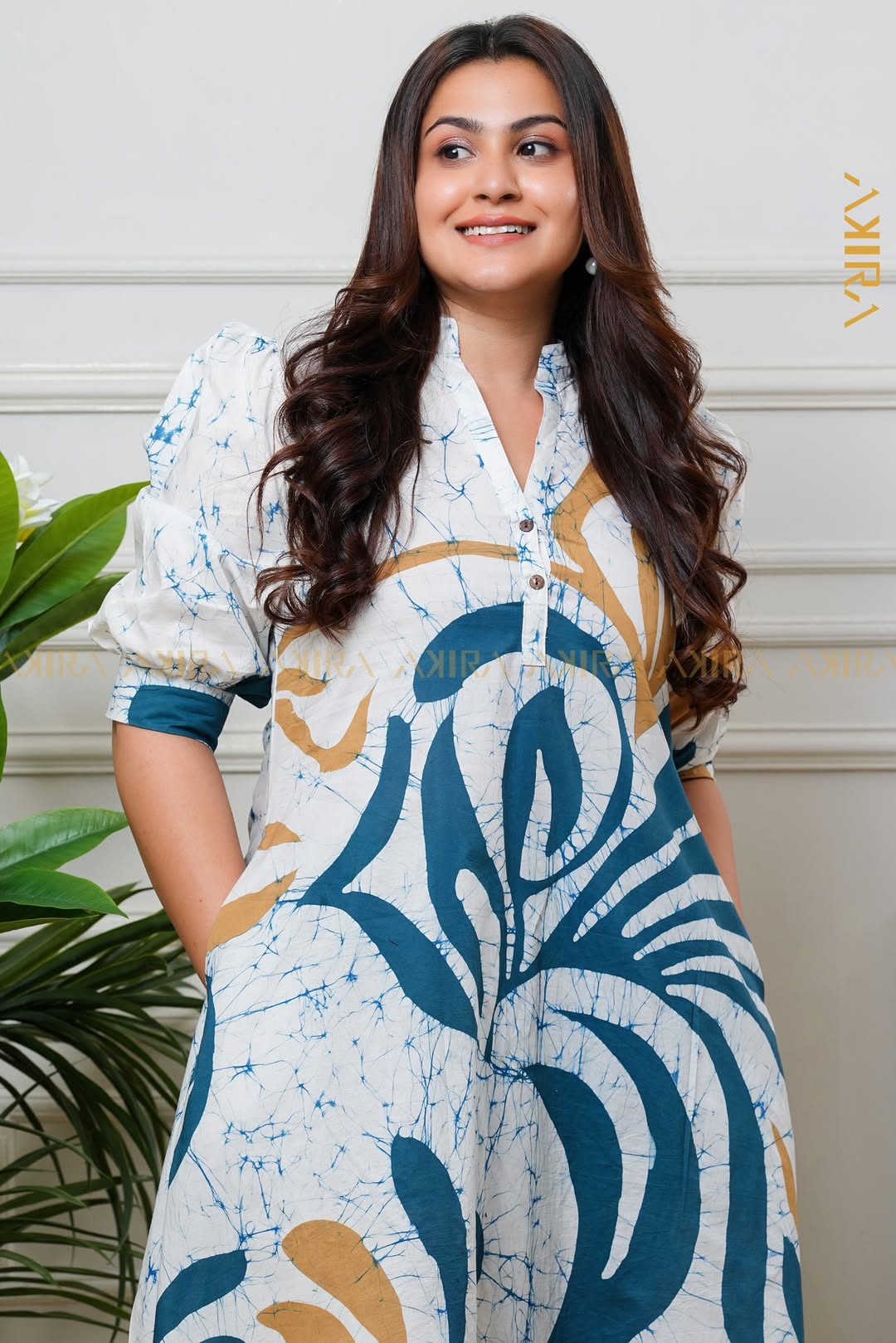 A rich green batik cotton dress, blending traditional wax-resist patterns with modern elegance for a fresh, timeless look.