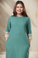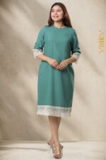 Ficus Lace Detail Dress features a striking blend of deep violet and soft lavender. The top of the dress is crafted in rich violet with a modest neckline and short sleeves, while the skirt flows in light lavender. This dress combines design with everyday comfort, perfect for both casual and formal occasions.