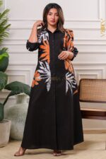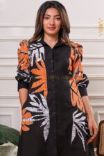 A Flora Blossom Batik Designer Dress adorned with delicate floral motifs, blending traditional artistry with a modern silhouette. It’s designed for warm weather or festive settings, offering both elegance and comfort.