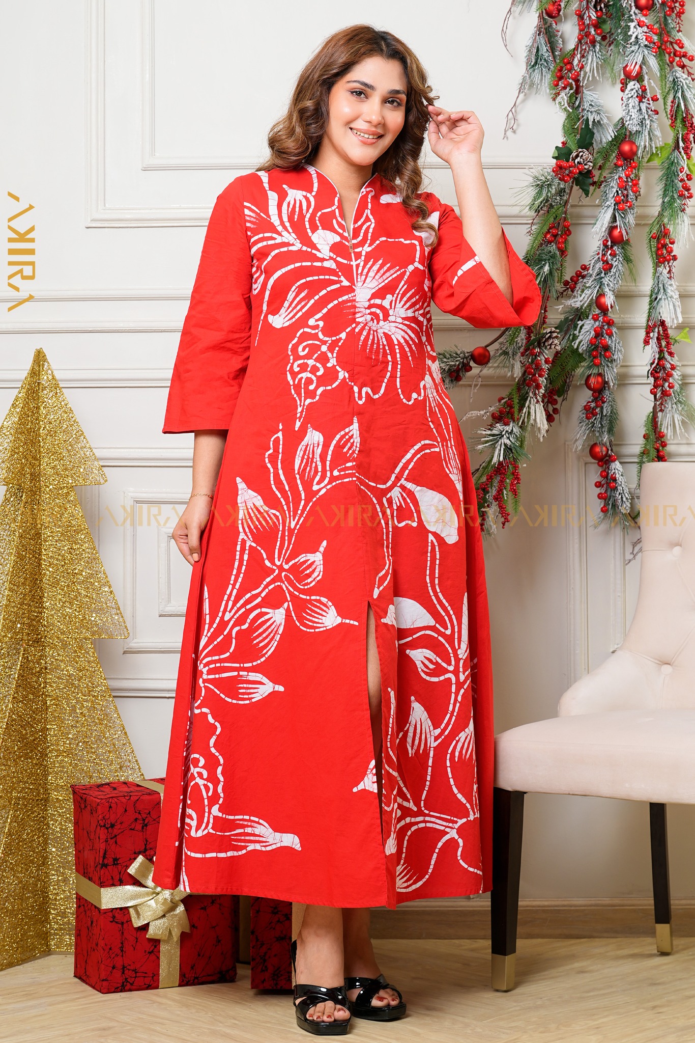 Flowery Redrose Batik Dress showcasing delicate floral batik artistry with timeless elegance.
