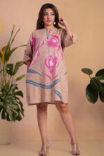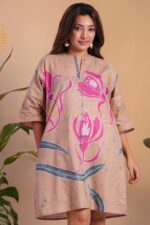 A soft batik-cotton dress with delicate “forgot-me-not” floral print, designed in a breezy, relaxed silhouette for a graceful, airy look
