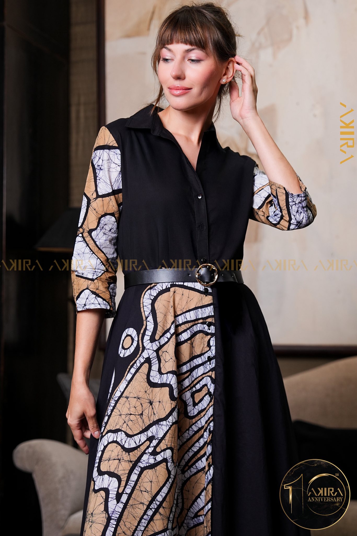 “Golden Aura Batik Flared Dress – a radiant batik piece with graceful flared charm.”