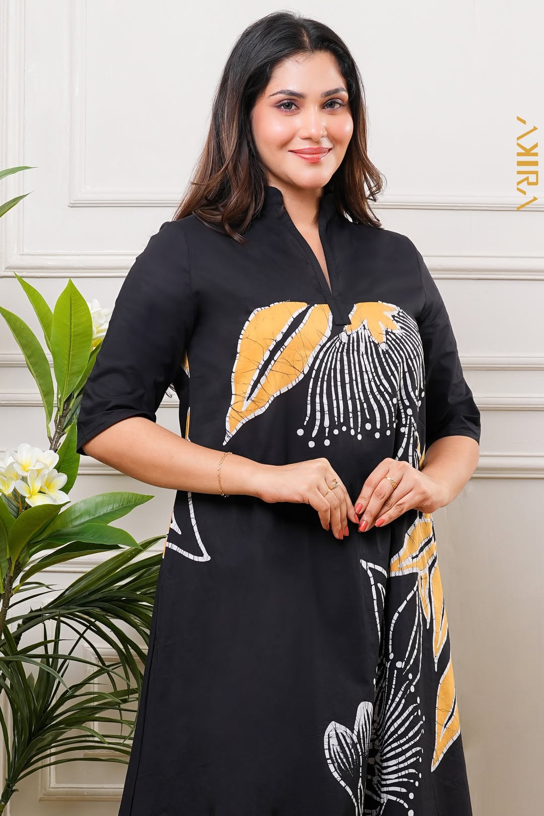 A Fleurish Petal batik dress is a stylish women’s dress featuring floral-inspired batik patterns on lightweight fabric, blending traditional textile art with a contemporary, feminine silhouette