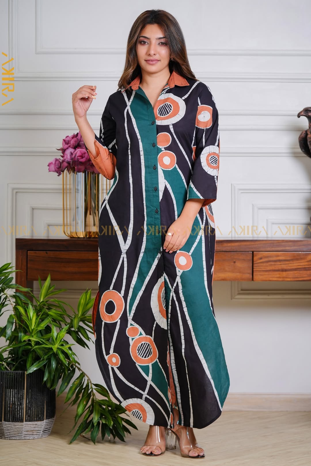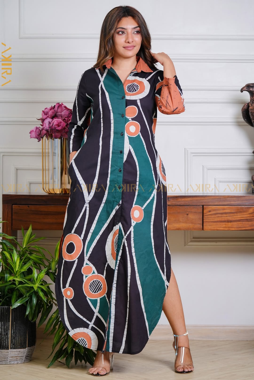 The Lily Detail Batik Dress features delicate batik patterns with refined detailing for a graceful, polished look.
