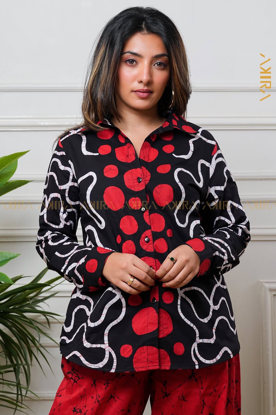 A stylish batik-print top adorned with cheerful daisy motifs, offering a breezy, casual look with artisan-inspired charm.