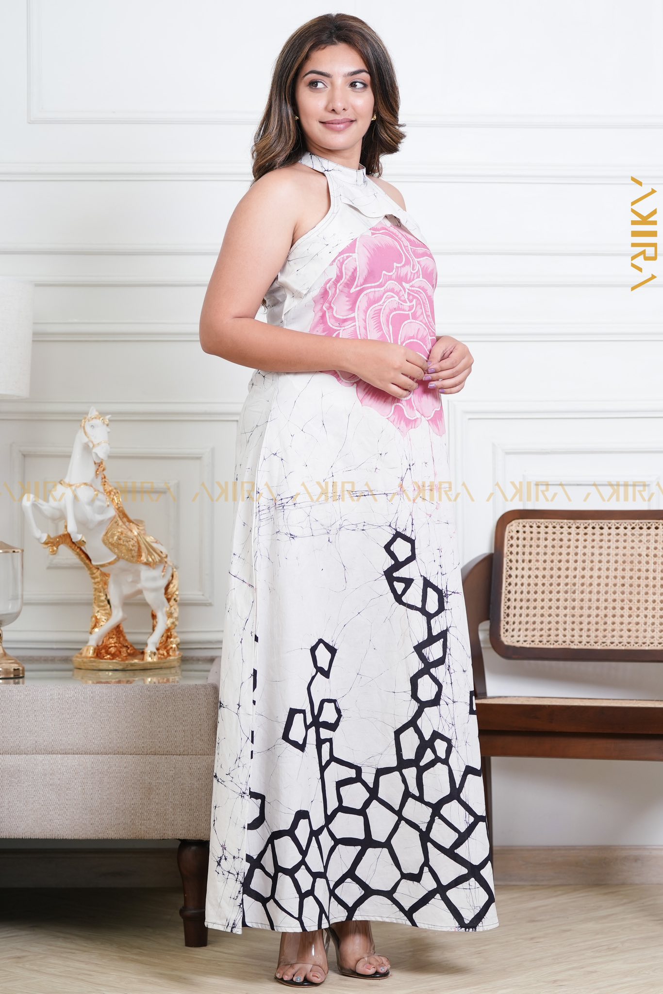 A Lotus Imprint Batik Designer Dress by the elegance of dahlias, featuring refined batik patterns in rich, feminine tones. Perfect for sophisticated gatherings and timeless charm.