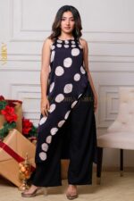 A stylish silk party top in a batik silk fabric with elegant design, perfect for special occasions.