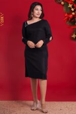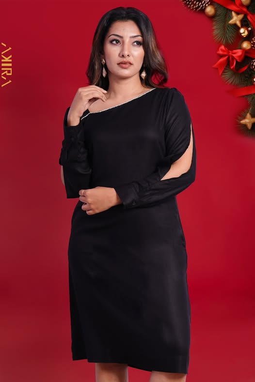 A glamorous dress with shimmering accents and a flowing silhouette, perfect for elegant evening celebrations.