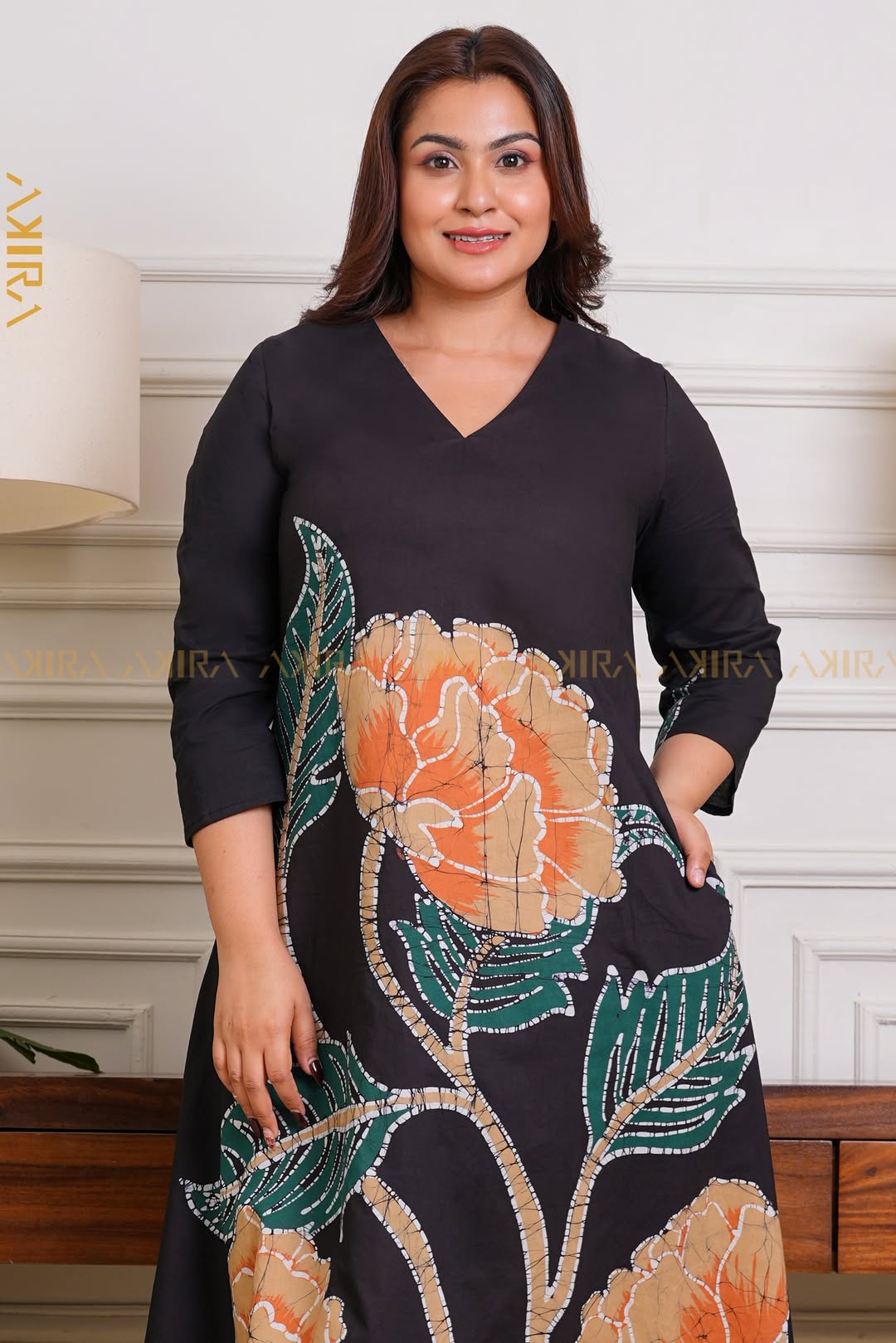 A Midnight Flora batik dress is a stylish dress featuring dark-toned floral batik patterns that blend traditional textile art with contemporary design for an elegant, eye-catching look