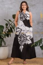 Midnight Mystique Dress  in rich crimson tones with intricate Java-inspired patterns.