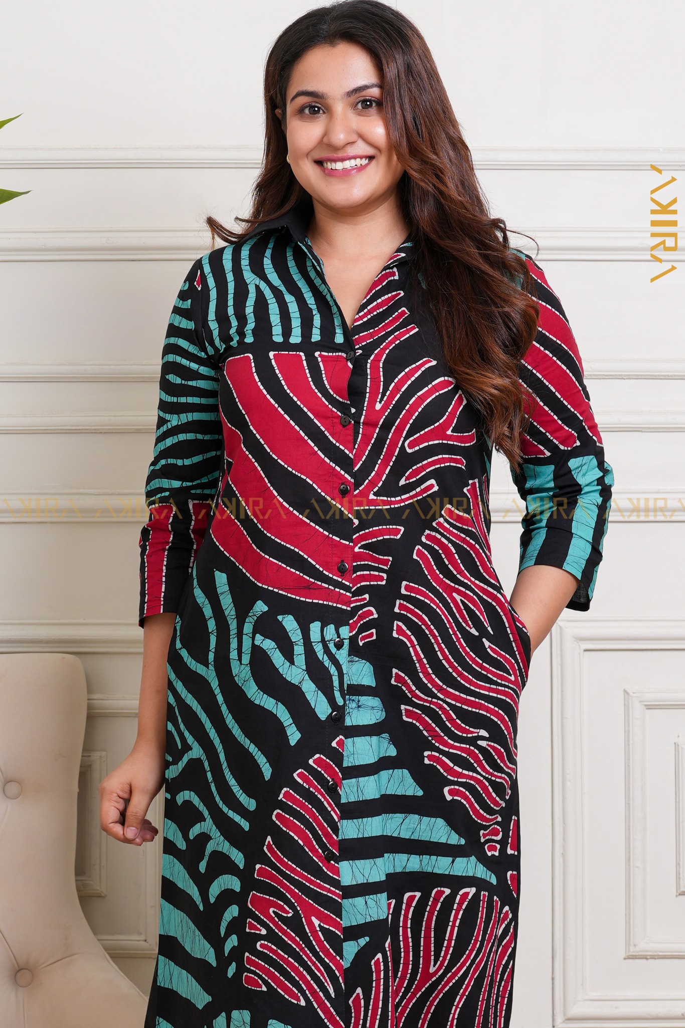 An exquisite batik cotton dress showcasing intricate handcrafted patterns with a refined, flowing silhouette. Designed for elegance and comfort, it’s perfect for festive occasions or sophisticated daytime events.