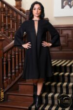 A sleek linen dress from Akira, cut in a clean, straight “line” silhouette.