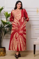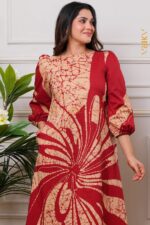 A chic, softly draped batik-print dress from Olian, combining elegant design with artistic patterning.
