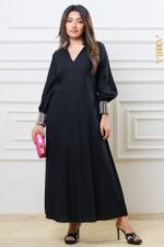 The Queen Midnight Dress shines with intricate work details and regal elegance.