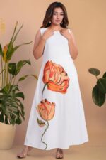 A graceful dress adorned with raised floral accents, adding texture and elegance for a refined, feminine look.