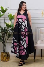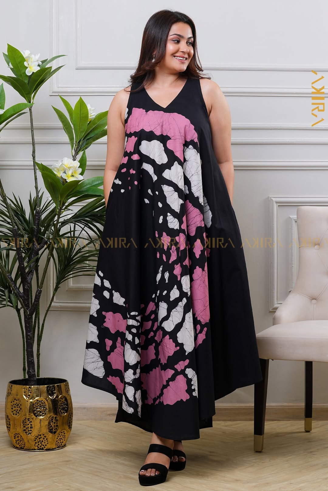 A sophisticated batik-print designer dress with luxe fabric and refined craftsmanship — elegant and timeless.