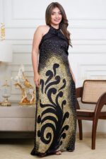 A glamorous silk party dress with shimmering details and a sleek silhouette, designed to make a sparkling statement at evening events and celebrations..