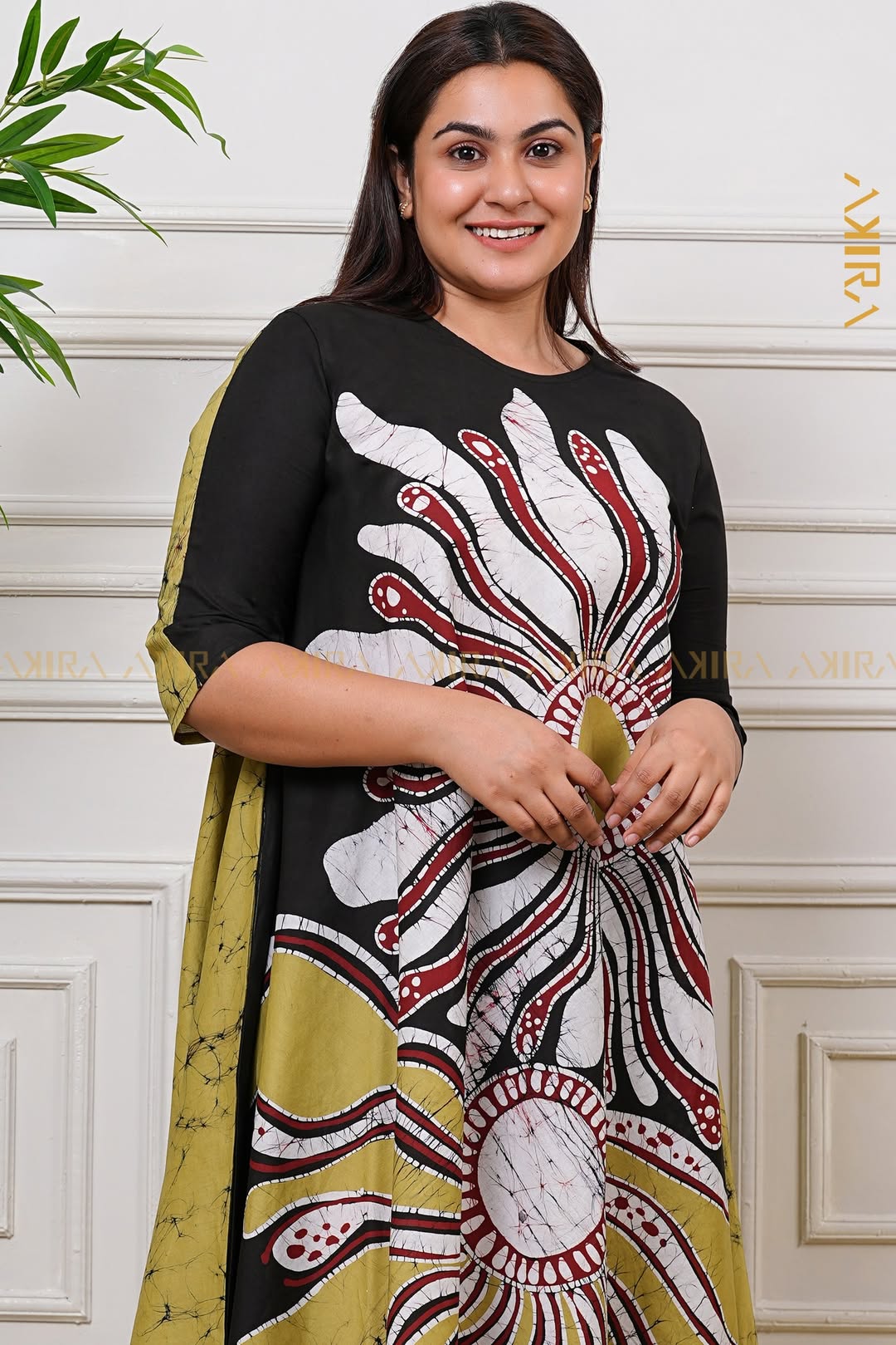 Graceful batik dress with shimmering starlight patterns and serene tones.