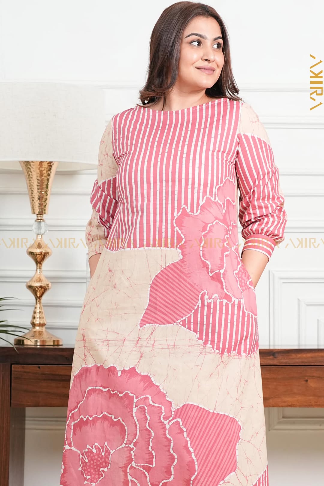 The Rose Meadow Batik Dress features soft floral batik patterns with a graceful, feminine silhouette for an effortlessly elegant look.