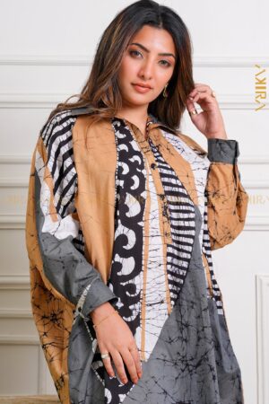patterned dress featuring artistic wax-resist dyed prints on breathable fabric, blending traditional craftsmanship with modern elegance for a chic, eye-catching look